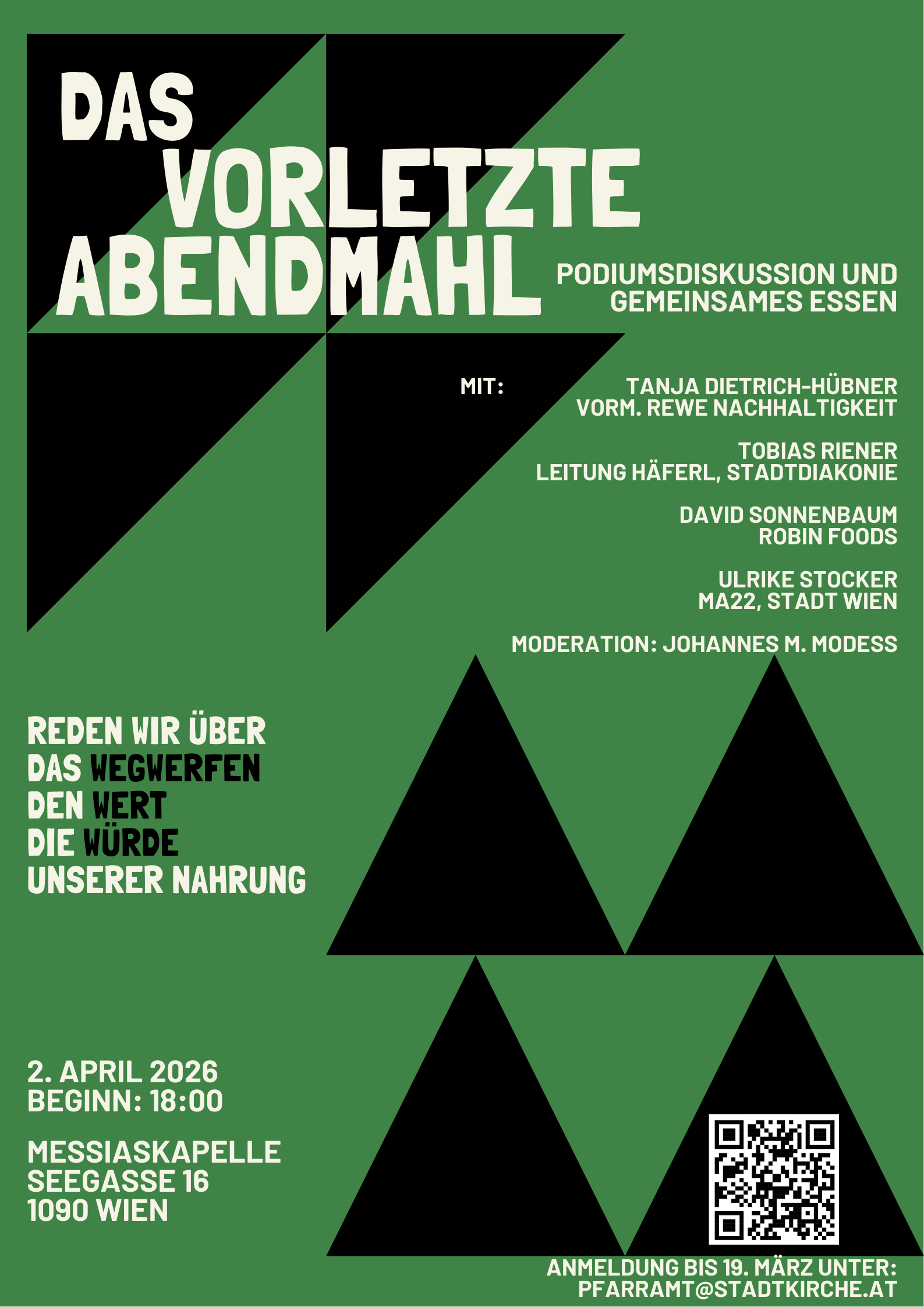 Wir freuen uns auf einen anregenden Austausch und das gemeinsame Mahl in der Evangelischen Messiaskapelle (1090 Wien, Seegasse 16a).